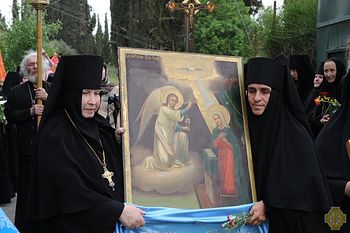 Накануне праздника чтимая икона Благовещения Пресвятой Богородицы переносится из Троицкого собора Русской Духовной Миссии в Горненскую обитель. В Троицком соборе служится молебен, который совершает иерарх Иерусалимского Патриархата. В этом году в переносе иконы участвовал архиепископ Герасский Феофан. Из Троицкого собора икону везут к источнику Божией Матери в селении Эйн-Карем, где её встречают игумения и сестры Горненского монастыря, а также многочисленные паломники. У источника читается отрывок из Евангелия от Луки, повествующий об этом событии, и крестный ход с иконой направляется через восточные врата монастыря в Казанский храм. Игумения и сестры Горненского монастыря поочередно несут эту икону по дорожкам, выложенным из живых цветов.