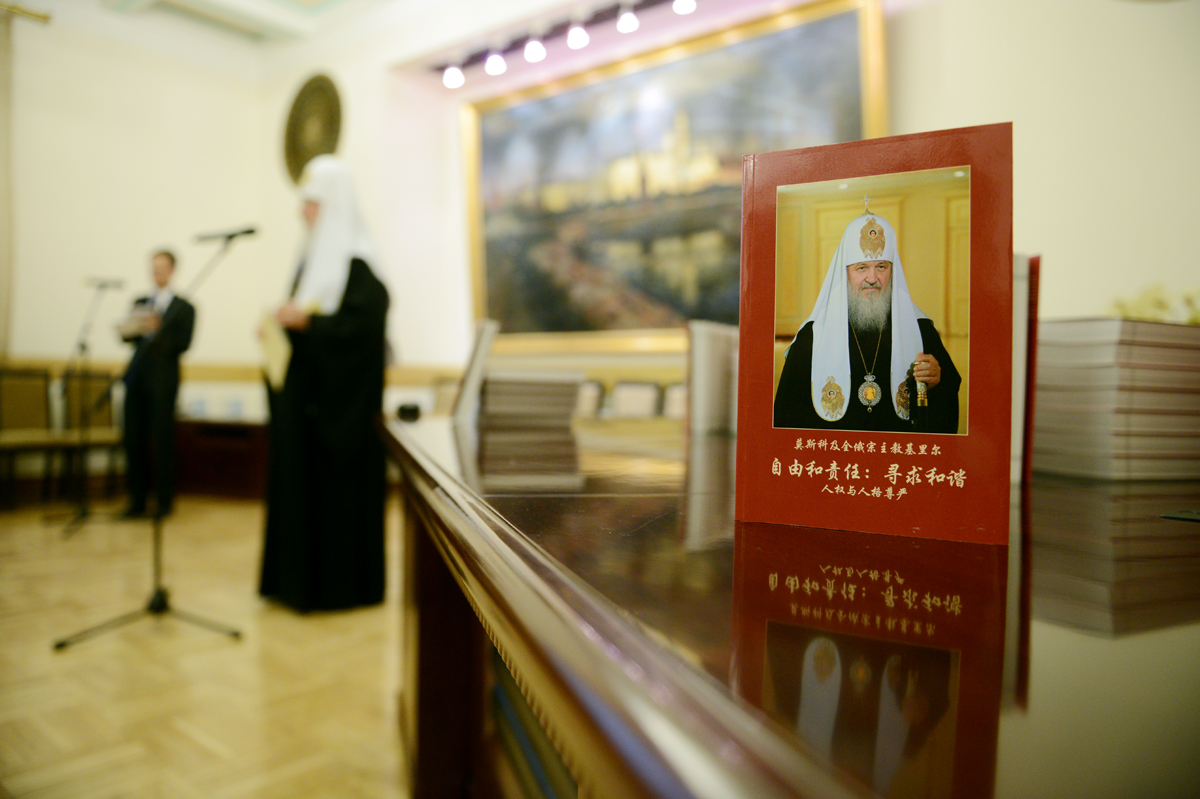 Далее к присутствовавшим обратился Святейший Патриарх Московский и всея Руси Кирилл. Он отметил, что представленная сегодня китайским читателям книга явилась плодом долгих размышлений, начало которых относится к началу 1990-х годов. «Постепенно я стал составлять тексты, публикация которых началась в конце того десятилетия. Данные тексты породили большую дискуссию как в России, так и в других странах мира. Мне приходилось много путешествовать в то время, в том числе и участвовать в обсуждении темы свободы», — рассказал Его Святейшество.