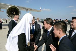 В харбинском аэропорту «Тайпин» Предстоятеля Русской Православной Церкви встречали генеральный консул России в городе Шэньяне С.Ю. Пальтов, директор Комитета по национальностям и религиям народного правительства провинции Хэйлуньцзян Лю Мин, заместитель директора Комитета по национальностям и религиям Чжан Кайфэн, председатель Харбинского городского комитета Ян Хайсинь.