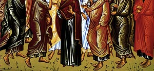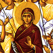 The Theotokos occupies a very special place in this icon 4. She is in the center of the icon, immediately below the ascending Christ. The gesture of her hands is gesture of prayer. She is clearly outlined by the whiteness of the garments of the angels 5. The Theotokos is depicted in a very calm pose. This is quite different from the appearance of the Disciples. They are moving about, talking to one another and looking and pointing towards heaven. The entire group, the Theotokos and the disciples represent the Church.