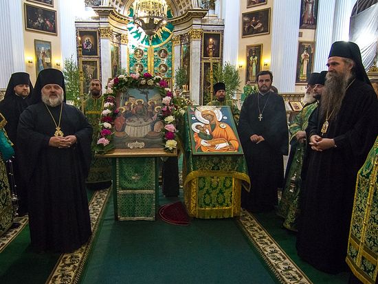 Его Преосвященству сослужили епископ Будимлянский и Никшичский Иоанникий и члены делегации Сербской Православной Церкви, прибывшей в обитель 19 июня. Сербское духовенство преподнесло братии лавры список чудотворной иконы Божией Матери «Млекопитательница».