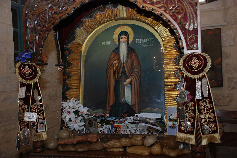 Святой Герасим Иорданский († 475, память 4 марта) родился в зажиточной семье в области Ликия, в Малой Азии. В детстве его отдали в монастырь. После паломничества по Святым местам он решил стать отшельником в пустыне, недалеко от впадения Иордана в Мертвое море, и около 455 года основал лавру. Сам он достиг такой степени аскетизма, что в течение всей Четыредесятницы обходился без пищи и только по воскресным дням принимал Святое Причастие. Однажды недалеко от монастыря он встретил льва, страдавшего от попавшей в лапу колючки финиковой пальмы, вынул занозу, очистил рану от гноя и перевязал ее. Так лев стал его верным другом и пять лет прожил со старцем, питаясь хлебом и мочеными овощами. А когда святой Герасим скончался, лев умер от тоски на его могиле.