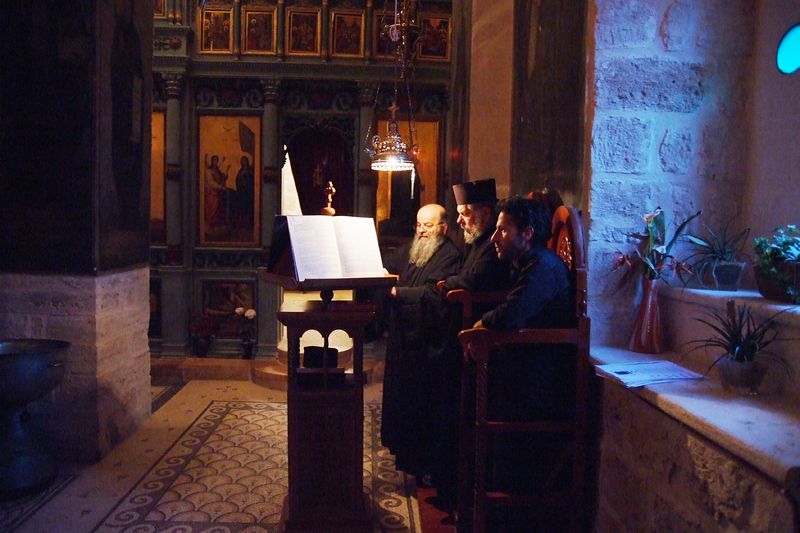 Литургию после возгласа «Благословенно Царство» обычно мы служим за час-полтора. Он же какие только молитвы ни произносил, преклонял колена, из его глаз непрестанно текли слезы! Службу мы начали в три часа ночи, а закончили в 11:30 дня. Всё его существо было погружено в молитву. Руки воздеты. Когда он молился, то не отвлекался ни на какие разговоры. Мы причастились, произнесли отпуст. Близился полдень! Восемь-девять часов я простоял на ногах! И потом мы перешли в дом, возле храма, отец Игнатий достал сухари, сладкое красное вино, которое делал сам, и оливки. Мы выпили вина, в котором размочили сухари, поели оливок.