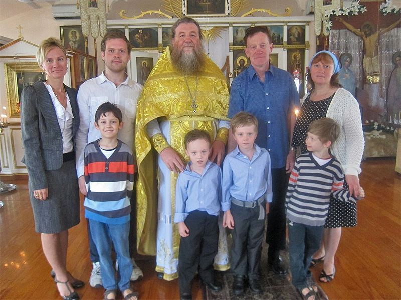 | Крестины в Свято-Никольском соборе Брисбена Джона и Джонатана Магдейд. 2013. В центре настоятель протоиерей Гавриил (Макаров). Джон и Светлана Магдейд с детьми и крестными. |
