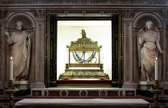 1893 год. Польский писатель Генрик Сенкевич и его молодая жена Мария отправились в свадебное путешествие по Италии. Сенкевич обдумывает роман о жизни первой христианской общины Рима. Ему уже ясен замысел; есть сюжет, герои, но… чего-то не хватает. Нужен какой-то непосредственный отправной пункт. Накануне супруги посетили собор святого Петра, но писатель не нашел там того, чего искал. Сегодня они пришли в базилику Сан-Пьетро-ин-Винколи (Святой Петр в веригах).