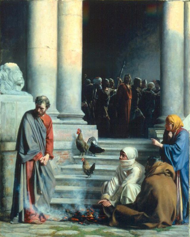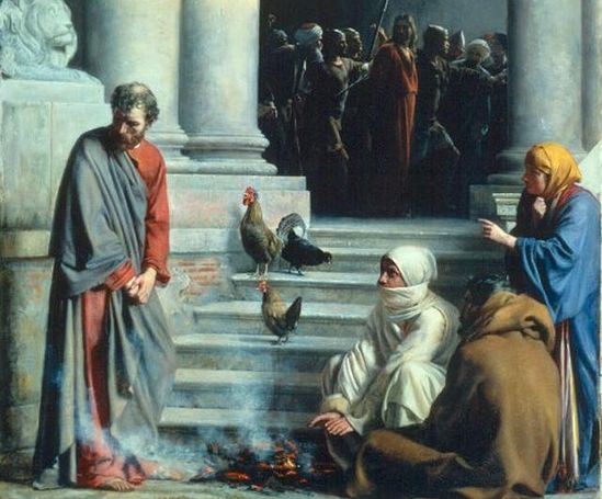 Тогда Господь, обратившись, взглянул на Петра, и вспомнил Петр слово, сказанное ему Иисусом: прежде, нежели пропоет петух, трижды отречешься от Меня. И выйдя вон, апостол горько заплакал.