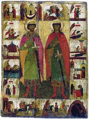 «Как «Сказание», так и служба уделяют внимание описанию военного заступничества святых по отношению к Русской земле и русским князьям, причем военные победы и победы в невидимой брани, над бесовскими силами, упоминаются в одном ряду: «ваю пособиемь и защищением князи наши пртиву въстающая дьржавьно побеждають и ваю помощию хваляться, вы бо темъ и намъ оружие ... меча обоюдуостра, има же дьрзость поганьскую низлагаемъ и дияволя шатания въ земли попираемъ» («Сказание»); «вражии ищезають полку, и поганьская телеса постилана бывають под нозе князь наших» (песнь 7, тропарь 1), «вы бо съкрушаета бесовьскыя козни и поганьскыя полкы ..., вернии князи наши державно побежаютъ», «и бесъ множьство исчезають, прогоними бывають неверныхъ полци пособием ваю» (группа стихир «Радуйся»).