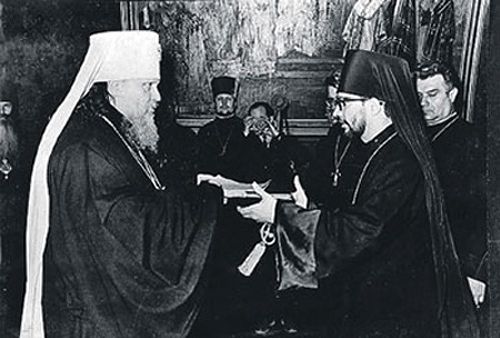 | Местоблюститель Патриаршего Престола митрополит Крутицкий и Коломенский Пимен (Извеков) вручает Томос об автокефалии Американской Православной Церкви епископу Ситкинскому и Аляскинскому Феодосию (Лазору). Москва, 1970 г. Фото с сайта www.orthodoxhistory.org |