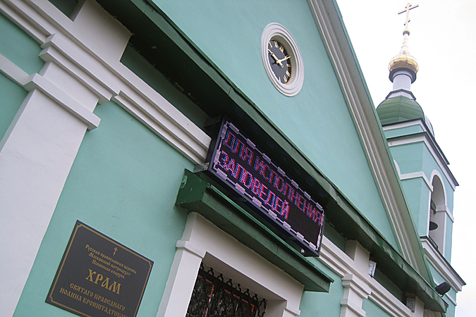 Модернизация добралась и до православия: это открытие мы сделали случайно, во время одной из командировок по области, когда увидели на стене Храма Иоанна Кронштадского в деревне Карамышево электронное табло. Такое же, как вешают в автобусах с бегущей рекламной строкой. Пригляделись, а там бегут… заповеди и молитвы.
