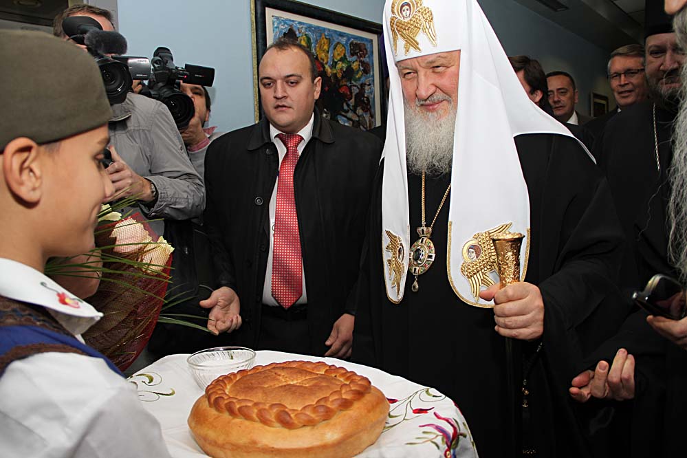 Поглавара свете Руске Цркве, по традиционалном обичају, дочекала су деца обучена у српске народње ношње, која су Патријарха московског г. Кирила послужили хлебом и сољу, уручивши му букет цвећа и јабуку. У холу аеродрома Његову Светост Патријарха московског поздравили су свештеници Архиепископије београдско-карловачке. Добродошлицу драгом госту из Русије упутили су и Преосвећена Господа Епископи рашко-призренски Теодосије, аустралијско-новозеландски Иринеј, јегарски Порфирије, моравички Антоније, протојереј Виталије Тарасјев - старешина Подворја Московске Патријаршије у Београду, као и др Милета Радојевић, директор Канцеларије за сарадњу с Црквама и верским заједницама. У згради аеродрома је одржана конференција за штампу.