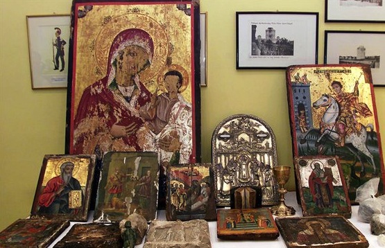 The police in Tirana, Albania, have confiscated over 100 icons and other works of art that had been stolen from Orthodox churches all over the country, and arrested two members of a band of smugglers.