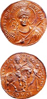 Имп. Юстин I. Солид. В 519 году, в правление императора Юстина, в Константинополь из Малой Скифии прибыли монахи во главе с Иоанном Максенцием. В ту пору уже не существовало скифского этноса: в Скифской, или Томитанской – по ее главному городу, провинции после великого переселения народов проживали разные этносы. В.В. Болотов полагает, что ставшие знаменитыми скифские монахи имели готское происхождение[1]. Среди них был также Леонтий, которого некоторые историки ошибочно отождествляют со знаменитым богословом Леонтием Византийским. Известно, что Леонтий из Скифии был родственником могущественного тогда полководца Виталиана – ревнителя Православия, учинившего неудачный мятеж против покровительствовавшего монофизитам императора Анастасия, вначале возвышенного, а потом устраненного при Юстине.