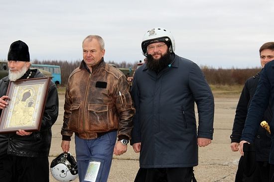 Далее епископ Исидор и протоиерей Валерий Калинин заняли места вторых пилотов, после чего два самолета Л-39 поднялись в небо. На борт, где в кресле второго летчика находился правящий архиерей, был взят образ Иверской Божией Матери. Пролетая над Вязьмой, архипастырь благословлял город чтимым образом.