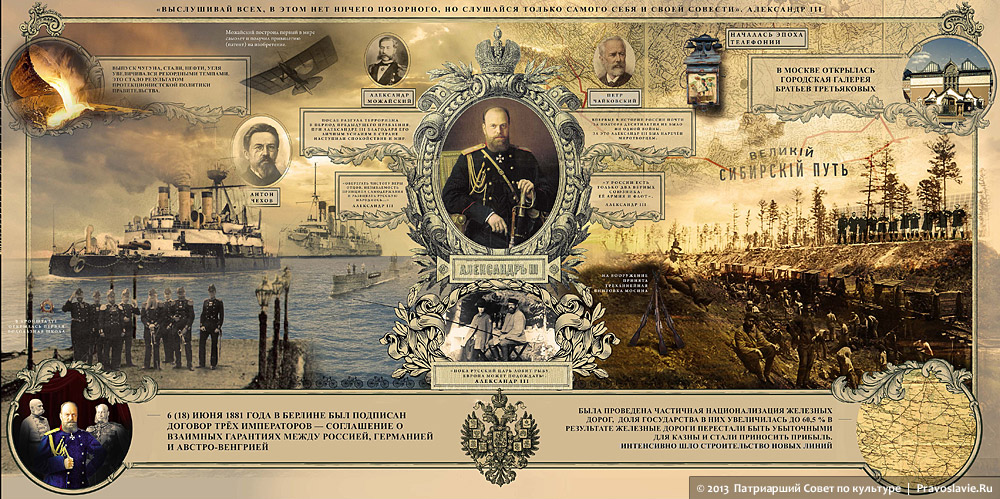 Мне очень понравилось, что не пропущена ни одна эпоха! Показана деятельность Александра III, сущность которой, по-моему, определяется его изречением, что «у России только 2 союзника: армия и флот». Это говорит о многом. В его царствование не было войн, но он отлично оснастил армию. Россия показала весь свой потенциал. Она стала мощной европейской державой.