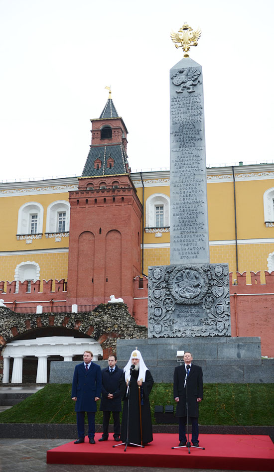 4 ноября 2013 года, в День народного единства, в Александровском саду у стен Московского Кремля Святейший Патриарх Московский и всея Руси Кирилл принял участие в церемонии открытия отреставрированного и повторно смонтированного обелиска, который впервые был воздвигнут сто лет назад в честь 300-летия царствования династии Романовых, сообщает Патриархия.ru.