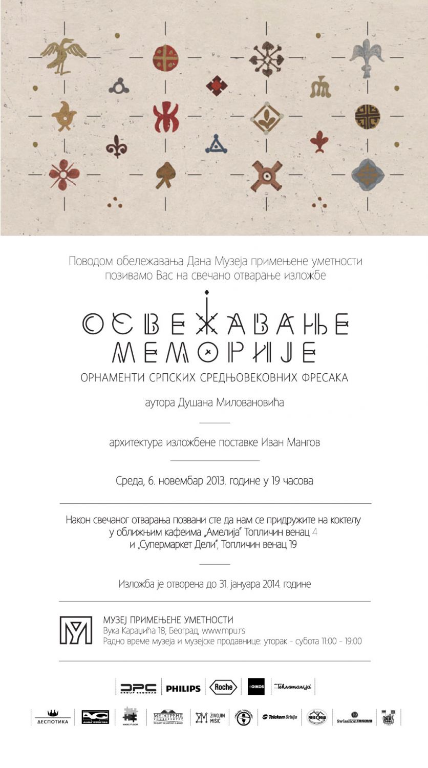 У среду, 6. новембра 2013. поводом дана Музеја примењене уметности, отвара се репрезентативна студијска изложба Орнаменти српских средњовековних фресака - Освежавање меморије, аутора Душана Миловановића, музејског саветника. Орнамент представља украс, шару, декоративни детаљ у примењеној уметности и архитектури, али има велику лепезу симболичних значење, културолошких и религиозних, подложних различитим анализама, па чак и математичком читању и тумачењу.