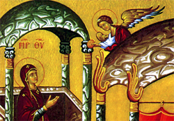 In the upper center portion of the icon, the Virgin is seated on the steps of the Holy of Holies. An angel is there, attending to the one chosen by God to bring the Savior into the world.
