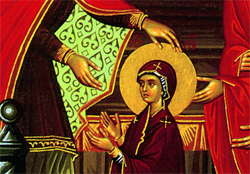 The holy Virgin ran toward the Temple, overtaking her attendant maidens and threw herself into the arms of the High Priest Zacharias, who was waiting for her at the gate of the Temple with the elders. Zacharias blessed her saying, "It is in you that He has glorified your name in every generation. It is in you that He will reveal the Redemption that He has prepared for His people in the last days."