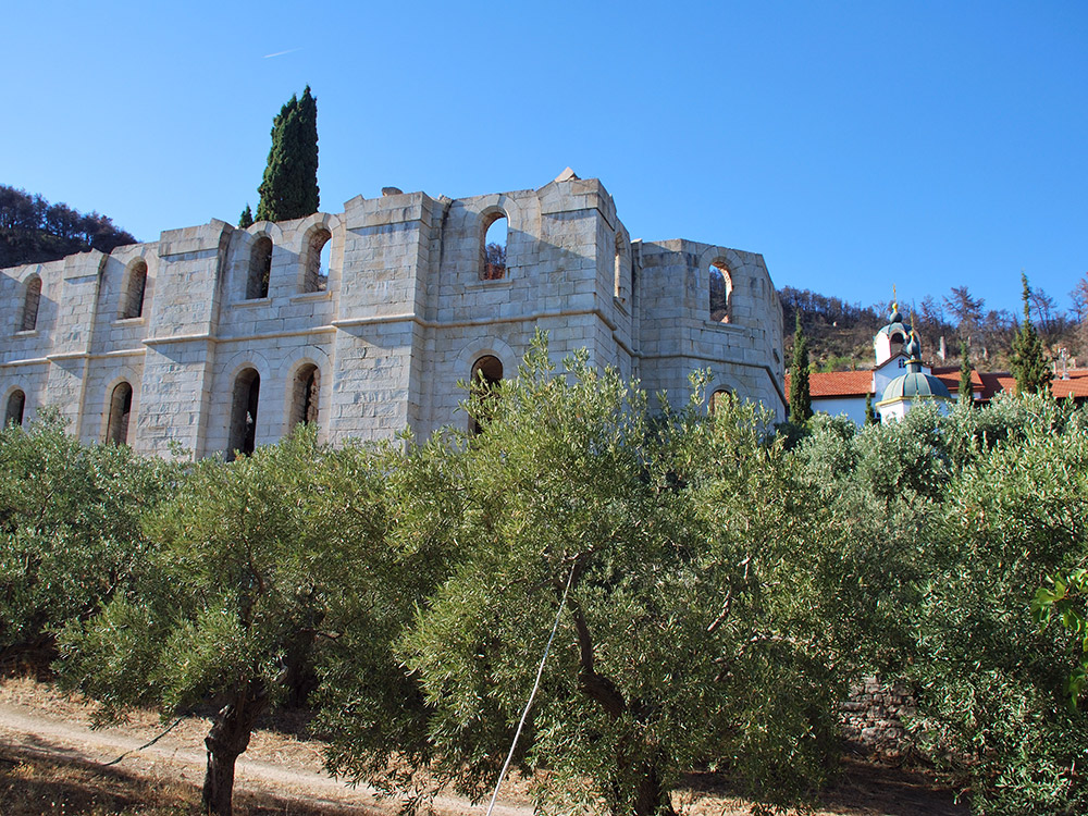 Зашел в протатский собор поклониться иконе Божией Матери «Достойно есть» и полюбоваться фресками Панселина, которыми очень гордятся греки. Келлия, где совершилось чудо, здесь неподалеку, и мне когда-то довелось бывать в ней. Радует, что реставрация собора во многом завершена и снят довольно безобразный каркас вокруг него.