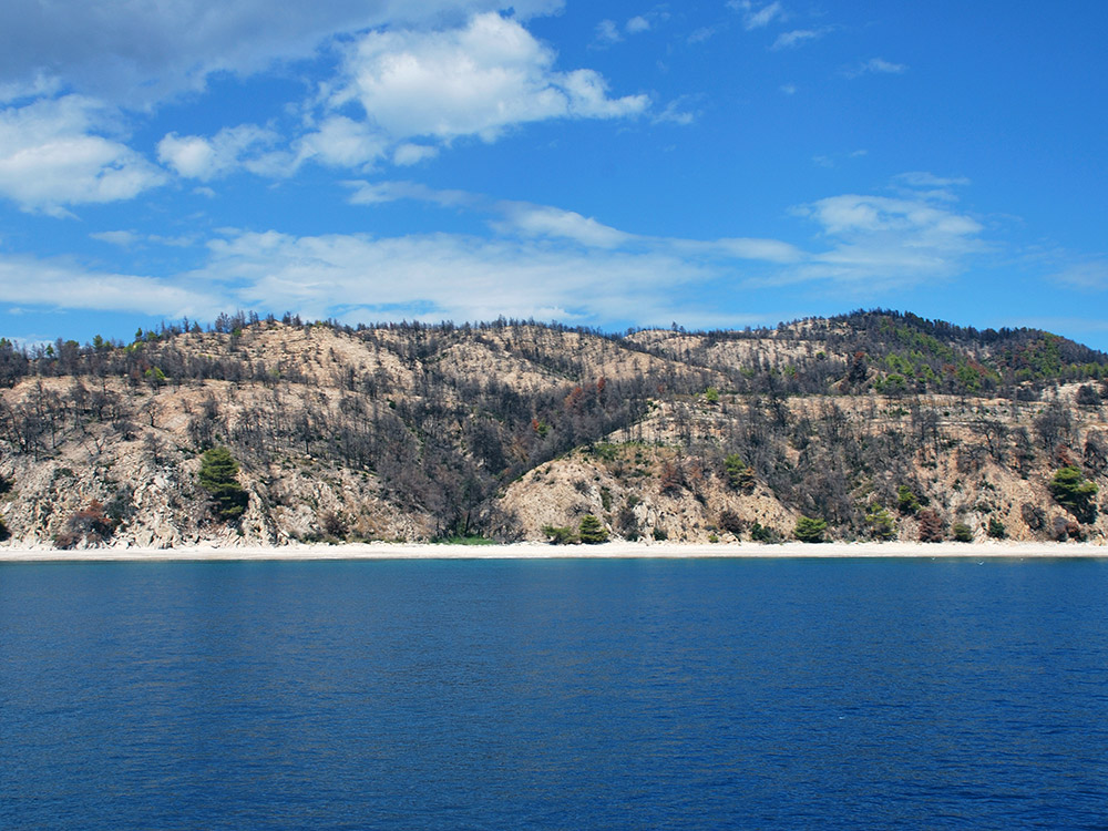 Теперь же поражаешься грандиозностью этой большой афонской пустыни, спрятавшейся на склоне горы и закрытой обычно деревьями и кустарником. После пожара разбросанные по долине келлии видны издалека. Как будто Сам Господь решил поведать о славной истории нашего русского монашества. Но, к сожалению, мы не можем долго пользоваться гостеприимством отца Владислава и паломников из России, и хозяева отвозят нас обратно на лодке…