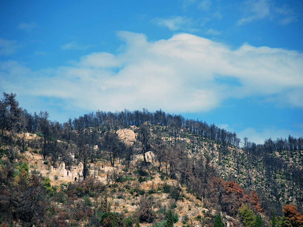 К нам подходят пантелеимоновский иеромонах Владислав и миряне – гости скита. Мы идем по корпусам, отец Владислав показывает нам параклисы. Поднимаемся вверх. Над скитом простирается большая долина, по которой разбросано некоторое количество келлий. Сама долина напоминает о недавнем пожаре. Кроме самого скита здесь чуть больше года назад выгорели и все пустующие келлии. Огонь чудом не тронул соборного храма и общих корпусов. Наверху бушевала огненная стихия. Время уничтожает следы пожара: всюду пробивается зелень. Но всё еще чернеют стволы обгоревших деревьев и кустарников, а под ногами то и дело оказывается пепел. Наш провожатый рассказывает нам о том, что первое время после пожара всё море внизу было черным после дождя – столько было золы и пепла. Пожар – страшное явление здесь, на Афоне. Иногда в огне гибли монастыри, храмы, книги и драгоценные рукописи. Летом сухой лес вспыхивает от малейшей искры, и остановить разбушевавшуюся стихию может только молитва. Да и страшный лесной пожар, начавшийся год назад недалеко от Крумницы, остановился только под стенами Хиландаря, когда к молящейся сербской братии принесли Пояс Богородицы.