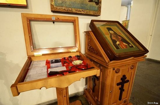 Выставка разместилась в трапезной части храма святителя Филиппа рядом с иконой преподобномученика Вениамина.