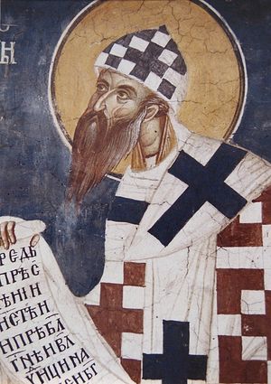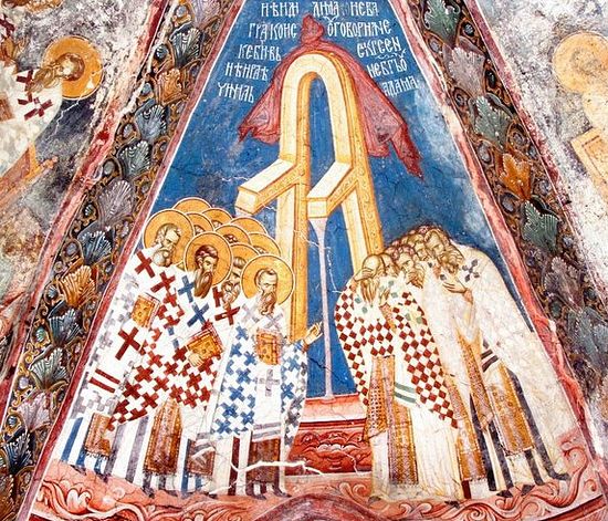 Кирилл патриарх Александрийский, свт XIV в Сербия. Косово. Монастырь Высокие Дечаны. На следующем заседании, 15 или, по другой датировке, 17 мая, продолжалось исследование учения Феодора Мопсуестийского. Зачитывались отрывки из творений авторитетных отцов, в особенности святых Кирилла Александрийского и Прокла Константинопольского, и других церковных писателей, в которых те отвергали учение Феодора и полемизировали с ним, а также из эдиктов императоров Феодосия II и Валентиниана III, осуждавших несторианскую ересь. Взяв слово, соборный протонотарий диакон Диодор доложил, что в одном из своих сочинений святой Кирилл похвалил Феодора и «сверх того святой памяти Григорий Назианзин писал к Феодору Мопсуестийскому, хваля его»[9], и предложил исследовать эти сочинения святых отцов. В результате их рассмотрения выяснилось, что, упоминая в одном из своих творений о «добром Феодоре», святитель Кирилл, тем не менее, критикует его богословские воззрения, а Григорий Богослов в упомянутых письмах обращался к другому Феодору – митрополиту Тианскому.