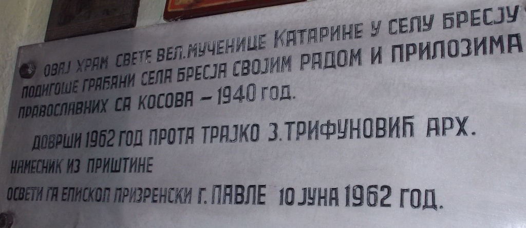 Податке о изградњи цркве имамо и у запису на мермерној плочи на зиду у цркви : ,,Овај храм Свете вел. Катарине у селу Бресју подигоше грађани села Бресја својим радом и прилозима православних са Косова 1940 год. Доврши 1962 прота Трајко З. Трифуновић арх. намесник из Приштине. Освети га епископ призренски г. Павле 10 јуна 1962 год.“