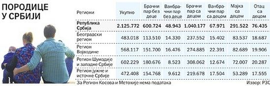 Готово свака трећа породица у Србији нема дете, а највећи број брачних партнера који овом свету неће оставити наследнике живи у руралним срединама, гласи најалармантнији податак Републичког завода за статистику, који је изведен из последњег пописа становништва. Увид у демографске графиконе сведочи да 33,3 одсто брачних парова у сеоским срединама нема наследника породичног домаћинства, док сваки четврти брачни пар у градским нема потомство. Готово 300.000 мајки само гаји дете, а највише их је у Београду – 17 одсто. На другој страни, свега 3,6 одсто очева сами подижу децу.