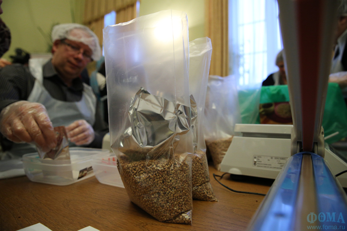 Начался рабочий день, как и положено, с молитвы. Владыка Пантелеимон отслужил молебен перед началом доброго дела, щердро окропил продукты и трудников, призвал всех поработать на славу. Специалисты из «Фудбэнк Рус» провели инструктаж — как пользоваться весами, как запаивать пакеты на специальнном аппарате.