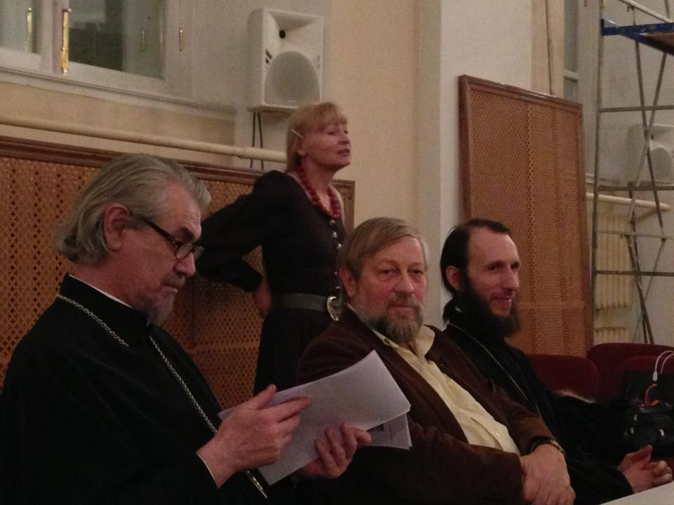 Ведущий вечера настоятель домового храма МГУ протоиерей Владимир Вигилянский представил публике драматурга, режиссера-документалиста, кинокритика, публициста, прозаика Александра Богатырева в первую очередь как своего друга, чем задал общую тональность мероприятию как встречи старых друзей.