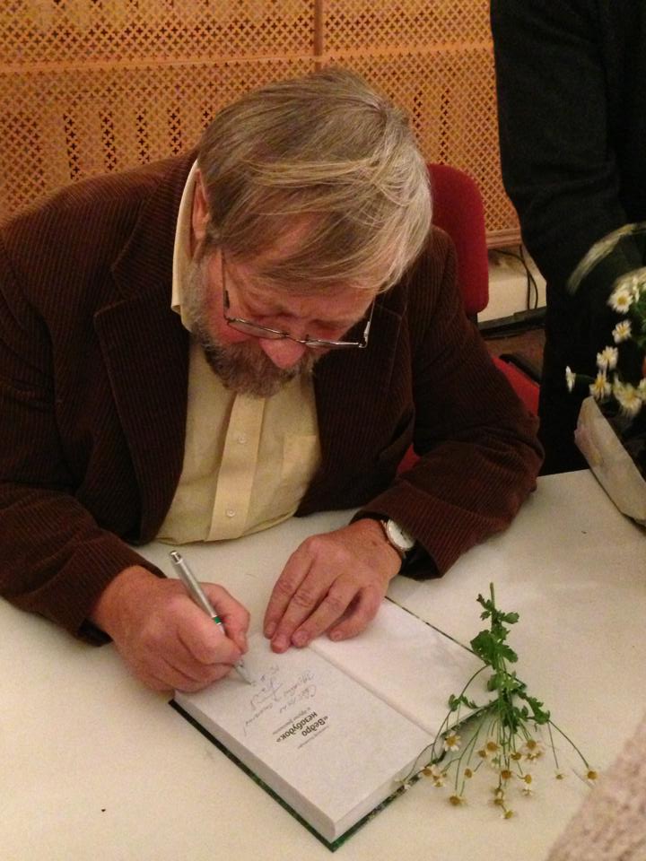 Первое, что бросалось в глаза пришедшим в храм мученицы Татианы в этот зимний вечер, – роскошный букет полевых цветов в ведерке из золотой фольги, напоминающий о названии книги – «Ведро незабудок» – и вообще сыгравший роль своего рода знакового эпитета, отражающего замысел книги и личность самого автора. Александр Богатырев пообещал раздать каждому гостю по веточке от радостного букета, что и выполнил в конце вечера, подписывая книги на память.