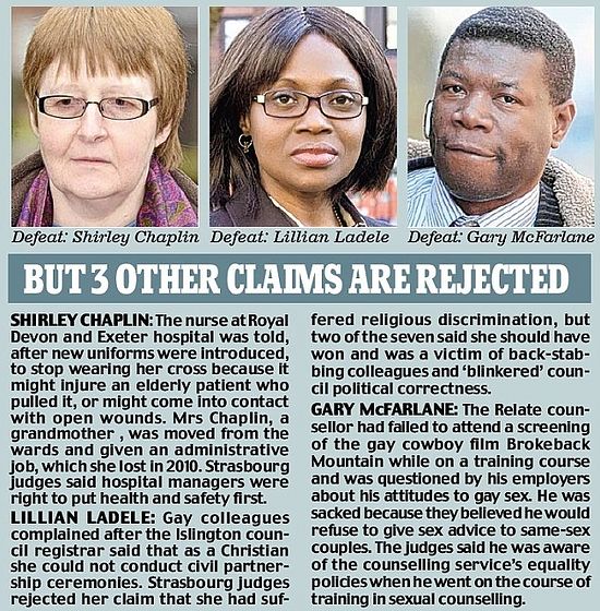 Суд постановил, что администрация больницы была права, когда потребовала от медсестры Ширли Чаплин снять нательный крестик из соображений безопасности и гигиены. Сама истица утверждала, что из-за отказа снимать крестик она потеряла работу.