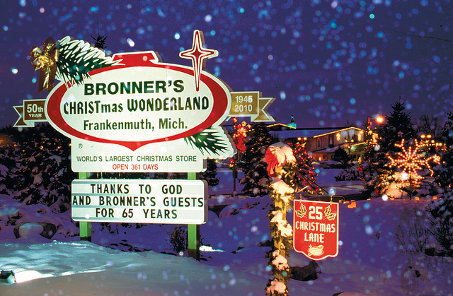 Плакат на въезде: Рождественская страна чудес Броннера. Франкенмут, Мичиган. Самый большой в мире Рождественский магазин, открыт 361 день. Благодаря Богу и гостям Броннера уже 65 лет.