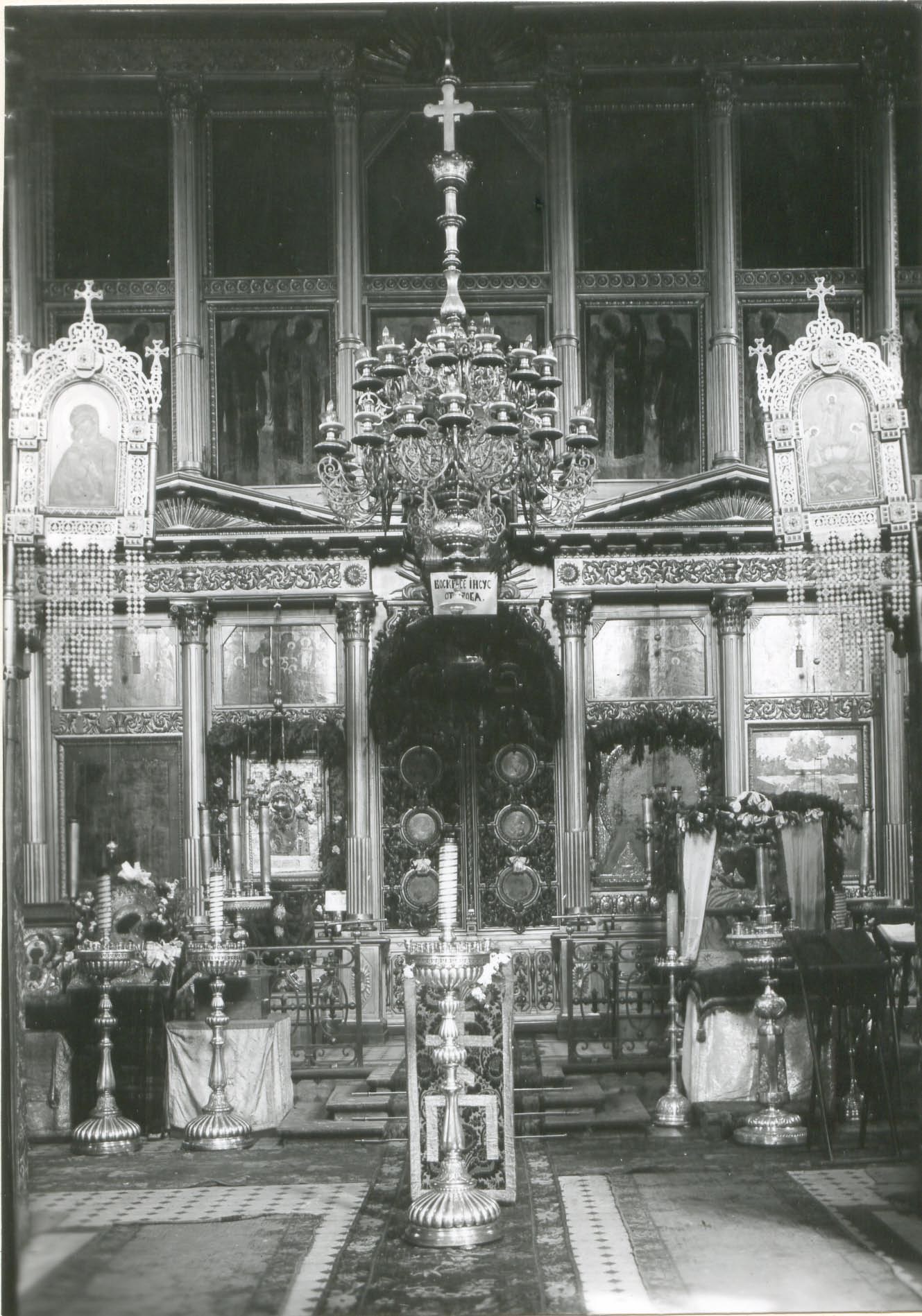 Иконостас соборной церкви деревянный, пятиярусный, местами резной. Над царскими вратами находилась Владимирская икона Божией Матери в медной вызолоченной ризе. По правую сторону от царских врат располагались следующие иконы: Нерукотворного образа Всемилостивого Спаса, Успения Божией Матери, святителя Николая, на южных вратах был изображен архистратиг Гавриил, справа от южных врат – икона святого Феодора Стратилата[27]. Слева от царских врат располагались иконы: Сретения Владимирской иконы Божией Матери, святого Иоанна Предтечи, на северной двери был изображен архистратиг Михаил, слева от северных врат – икона святой мученицы Агафии[28].