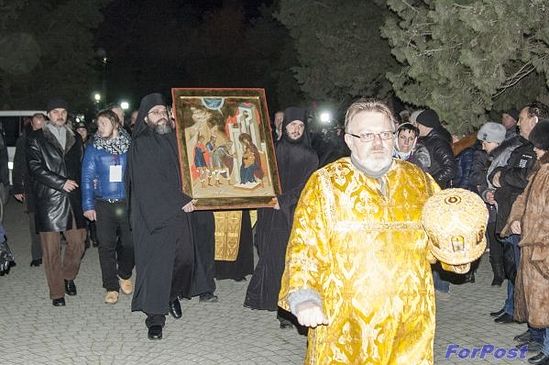 Ночью, 1 февраля, возле памятника святому апостолу Андрею Первозванному в Севастополе духовенство, влсти города, представители флота и немыслимое число горожан встретили Честные Дары, сообщает Севастопольский новостной портал.