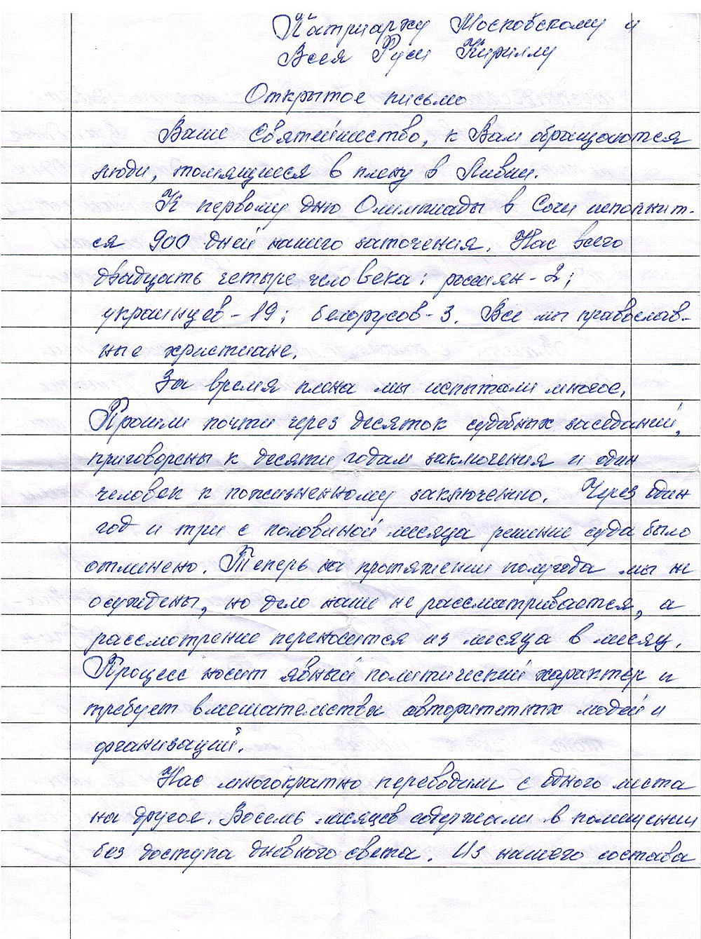 К первому дню Олимпиады в Сочи исполнится 900 дней нашего заточения. Нас всего двадцать четыре человека: россиян — 2; украинцев — 19; белорусов — 3. Все мы православные христиане.
