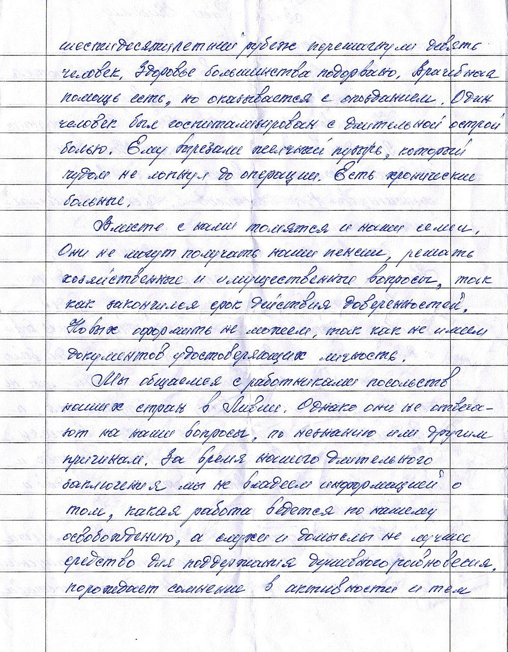 Нас многократно переводили с одного места на другое. Восемь месяцев содержали в помещении без доступа дневного света. Из нашего состава шестидесятилетний рубеж перешагнули девять человек. Здоровье большинства подорвано. Врачебная помощь есть, но она оказывается с опозданием. Один человек был госпитализирован с длительной острой болью. Ему вырезали желчный пузырь, который чудом не лопнул до операции. Есть хронические больные.