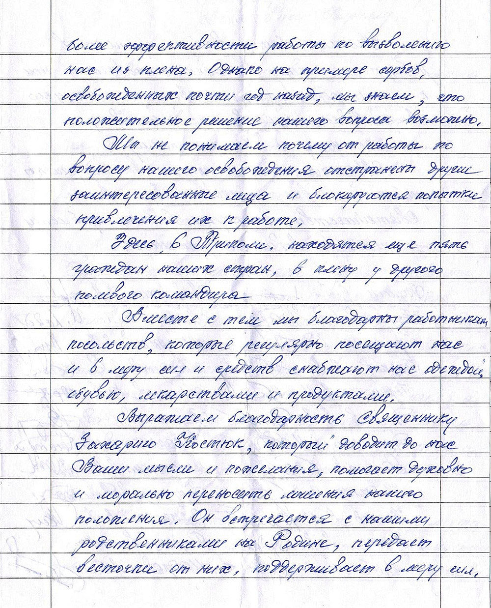 Выражаем благодарность священнику Захарии Керстюку, который доводит до нас Ваши мысли и пожелания, помогает духовно и морально переносить лишения нашего положения. Он встречается с нашими родственниками на Родине, передает весточки от них, поддерживает в меру сил.