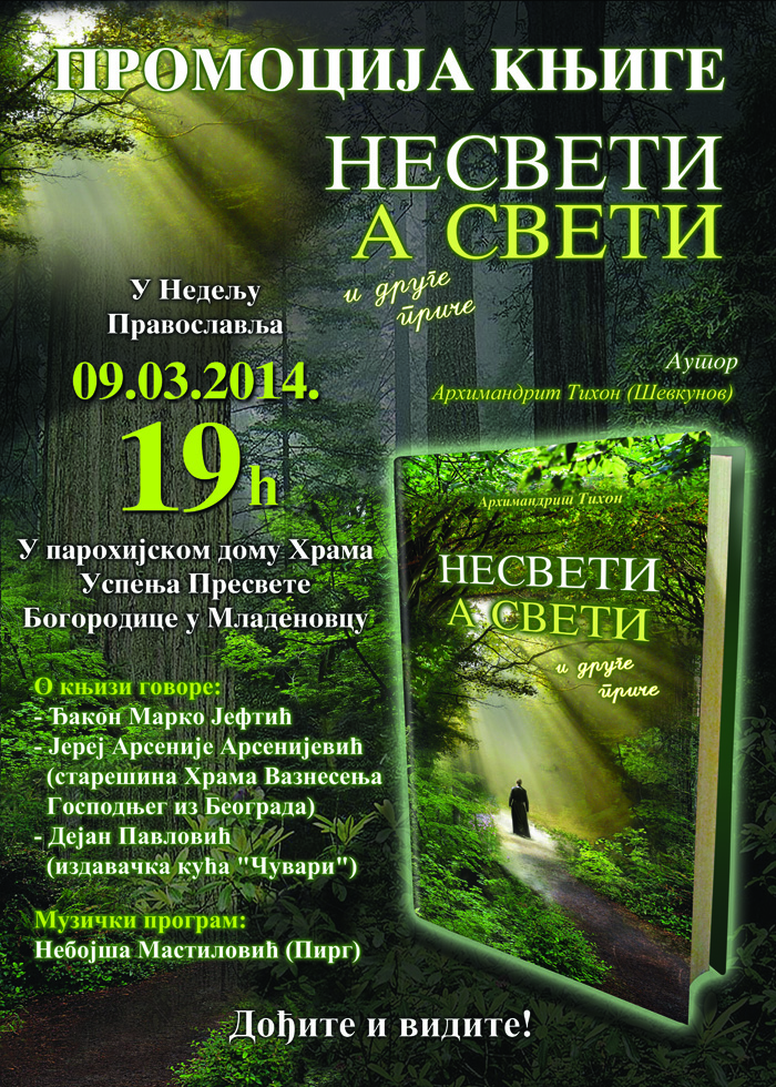 У Недељу Православља, 9. марта 2014.године у 19.00 биће одржана промоција књиге “ Несвети а свети“ у Младеновцу.
