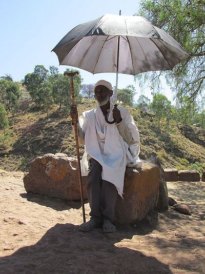 Чуть в отдалении, немного наособицу находится храм святого великомученика и Победоносца Георгия, пожалуй наиболее почитаемого в Эфиопии святого. Если Лалибелу называют «Эфиопией в миниатюре», то этот храм смело можно назвать лицом, нет, даже ликом Лалибелы. Вы поднимаетесь на скалу, и перед вами открывается широчайший простор: небо и горы, ветер вам пронизывает душу, но главное, что моментально овладевает всем вашим существом, – это даже не великолепие природы, а то, что находится под вами: огромной величины крест – тот самый храм великомученика. Чтобы войти в церковь, нужно спуститься по довольно крутой тропинке метров 15, что вы и делаете. Оказавшись внизу, чувствуете себя, ну, скажем, собеседником Пророка Давида, уже по-настоящему вслушиваясь в его слова: «Господи, я – червь, а не человек». И дело тут не столько в мощи и высоте каменного шедевра, который вовсе не давит на вас, а просто рассказывает о вещах гораздо более значимых для души, чем бедность, кризис на Украине или инфляция.
