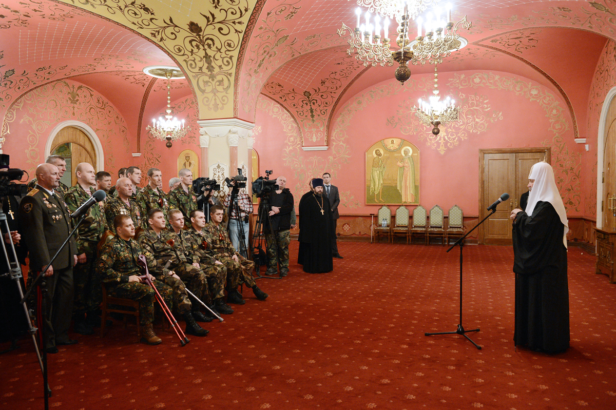 Затим је у Црвеној сали Храма Христа Спаситеља одржан састанак Његове Светости Патријарха Кирила са војним лицима и ветеранима Унутрашње војске МУП-а Русије.