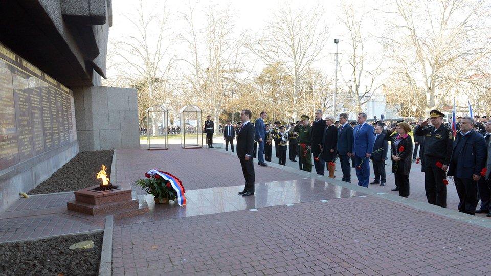 Председник Владе РФ Дмитриј Медведев положио је венац на Вечну ватру Меморијала херојске одбране Севастопоља, саопштава РИА-Новости.