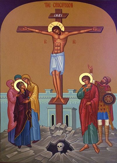 Christ is nailed to the Cross; His right side is pierced and the wound flows with blood and water.