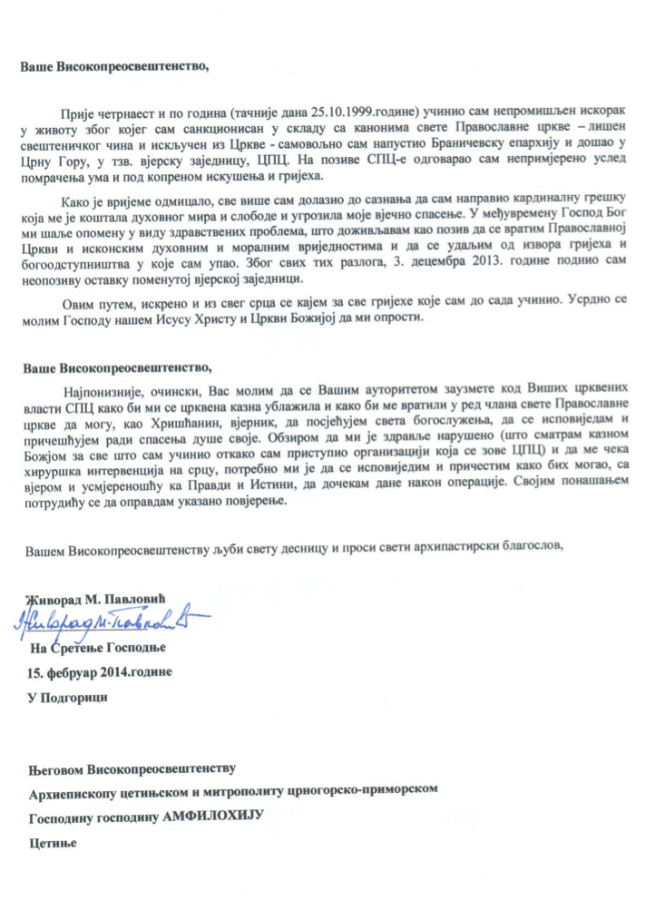 Најпонизније, очински, Вас молим да се Вашим ауторитетом заузмете код Виших црквених власти СПЦ како би ми се црквена казна ублажила и како би ме вратили у ред члана свете Православне цркве да могу, као Хришћанин, вјерник, да посјећујем света богослужења, да се исповиједам и причешћујем ради спасења душе своје. Обзиром да ми је здравље нарушено (што сматрам казном Божјом за све што сам учинио откако сам приступио организацији која се зове ЦПЦ) и да ме чека хируршка интервенција на срцу, потребно ми је да се исповиједим и причестим како бих могао, са вјером и усмјереношћу ка Правди и Истини, да дочекам дане након операције. Својим понашањем потрудићу се да оправдам указано повјерење.