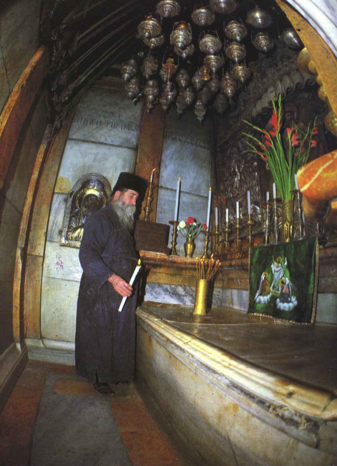 В это время вокруг Кувуклии, внутри которой находится Гроб Господень, проходили пасхальные крестные ходы христианских конфессий, которые имели свои приделы в храме. Пропуская очередной крестный ход, мы с Зинаидой оказались слева от Кувуклии, среди группы армянского духовенства.