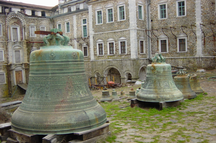 Колокольня собора – самая высокая на Афоне (40 м), на ней находилось двадцать пять колоколов, в том числе и пятитонный дар великого князя Алексея Александровича. Сейчас часть колоколов, лопнувших после пожара, грустно стоят во дворе скита под навесом.