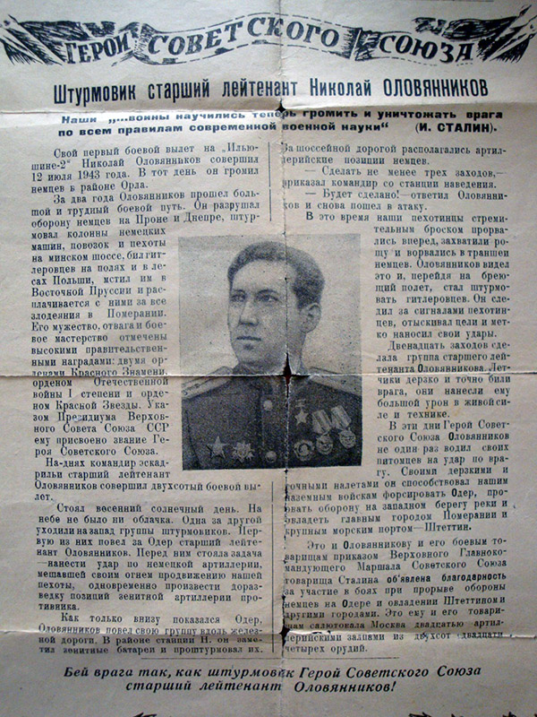 – За 25 минут подавить на плацдарме огневые точки противника, которые вели огонь по нашим войскам. Когда я подходил к цели, по нашей группе из восьми самолетов начала стрелять немецкая зенитная артиллерия. Чтобы не сбили, я стал маневрировать, ушел от обстрела, затем подавил зенитную артиллерию. Потом начал уничтожать огневые точки противника. С боевым заданием справился на пять минут раньше. По радио мне передают, чтобы возвращался обратно в часть. Но у меня еще оставалось время. На малой высоте я пролетел над Одером. Вижу: на лодках и на плотах переправляются наши солдаты. Я им помахал плоскостями, а они мне в ответ подбросили свои шапки. Только после этого я полетел на аэродром. Подхожу к аэродрому на любимом бреющем полете и вижу: на земле красное полотно метров на пятнадцать лежит, на нем написано: «Приветствуем Оловянникова, совершившего 200-й вылет!» На аэродроме в это время был член Военного совета 4-й воздушной армии генерал Ф. Веров. Я подошел к командиру полка доложить о выполнении задания, а Веров спрашивает у него обо мне: «Ну, какой он командир эскадрильи?» Командир ответил, что я мастер точечных ударов. Тогда Веров велел ему позаботиться о том, чтобы мне дали вторую Звезду. Но ее я в итоге так и не получил.