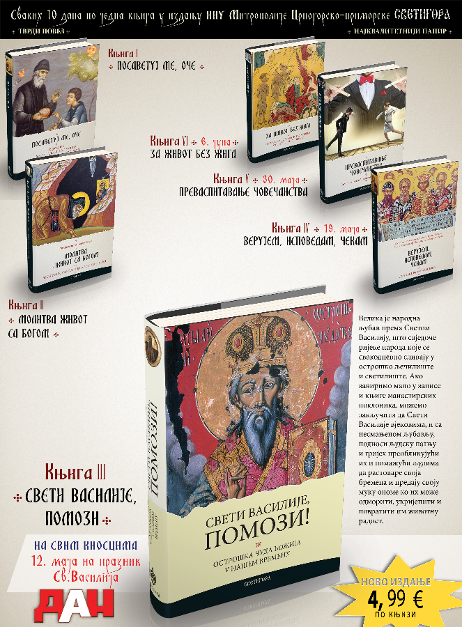 Православни вјерници у Црној Гори са посебним поштовањем прослављају празник, свог заштитника и заступника пред Богом, Светог Василија Острошког. Тим поводом ИИУ Светигора је објавила књигу „Свети Василије, помози – Острошка чуда Божија у нашем времену“, која ће се од празника (12. маја), посредством дневних новина Дан наћи на трафикама широм Црне Горе.