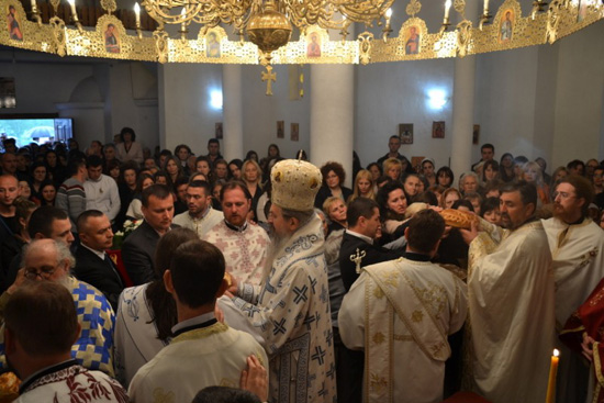Након заамвоне молитве обављен је обред Литије око храма након чега је Епископ Теодосије благословио славски колач и жито.